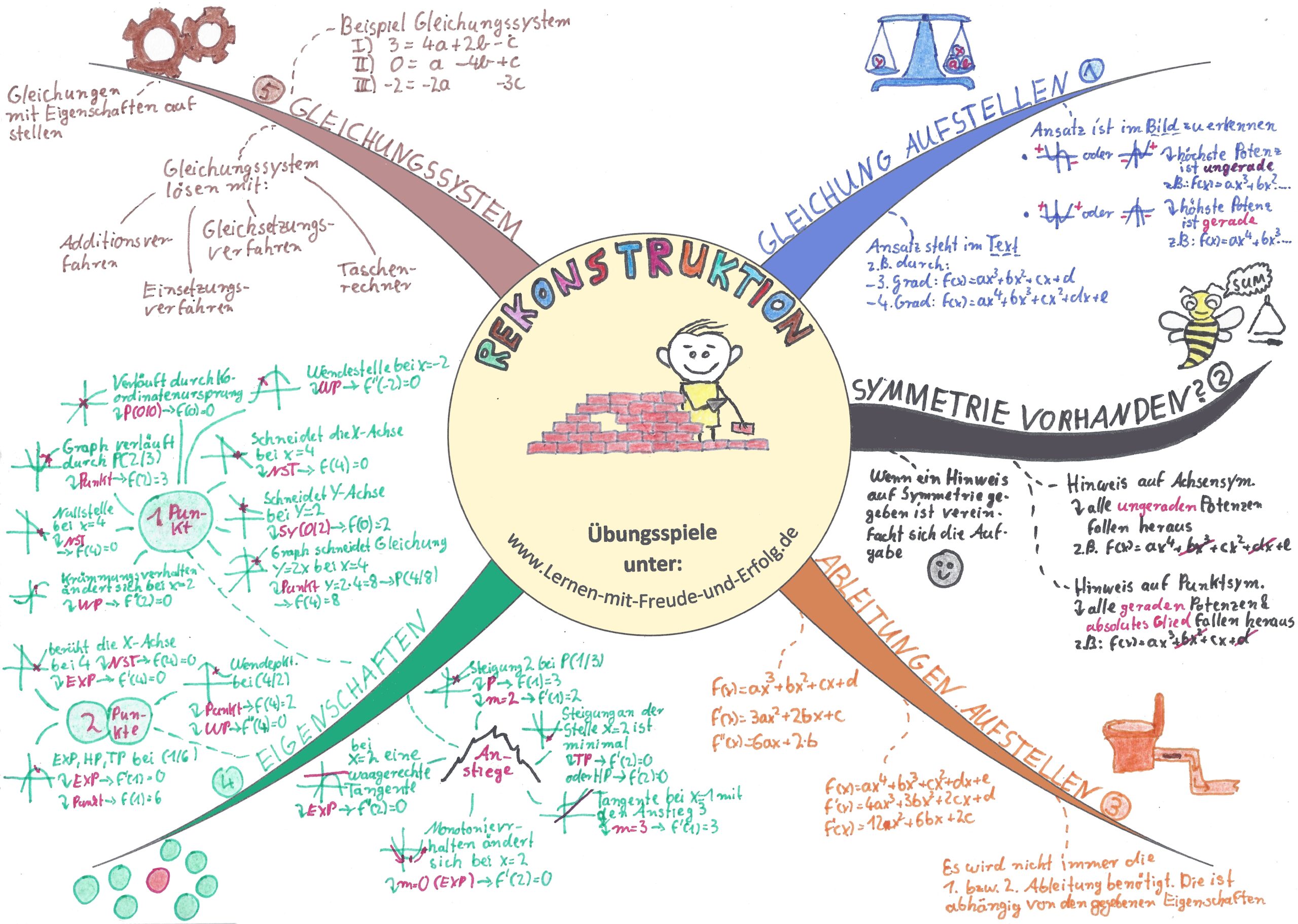 Mindmap zur Rekonstruktion von Funktionen mit Funktionsgleichung bestimmen, Gleichungssystemen, Ableitungen und Eigenschaften