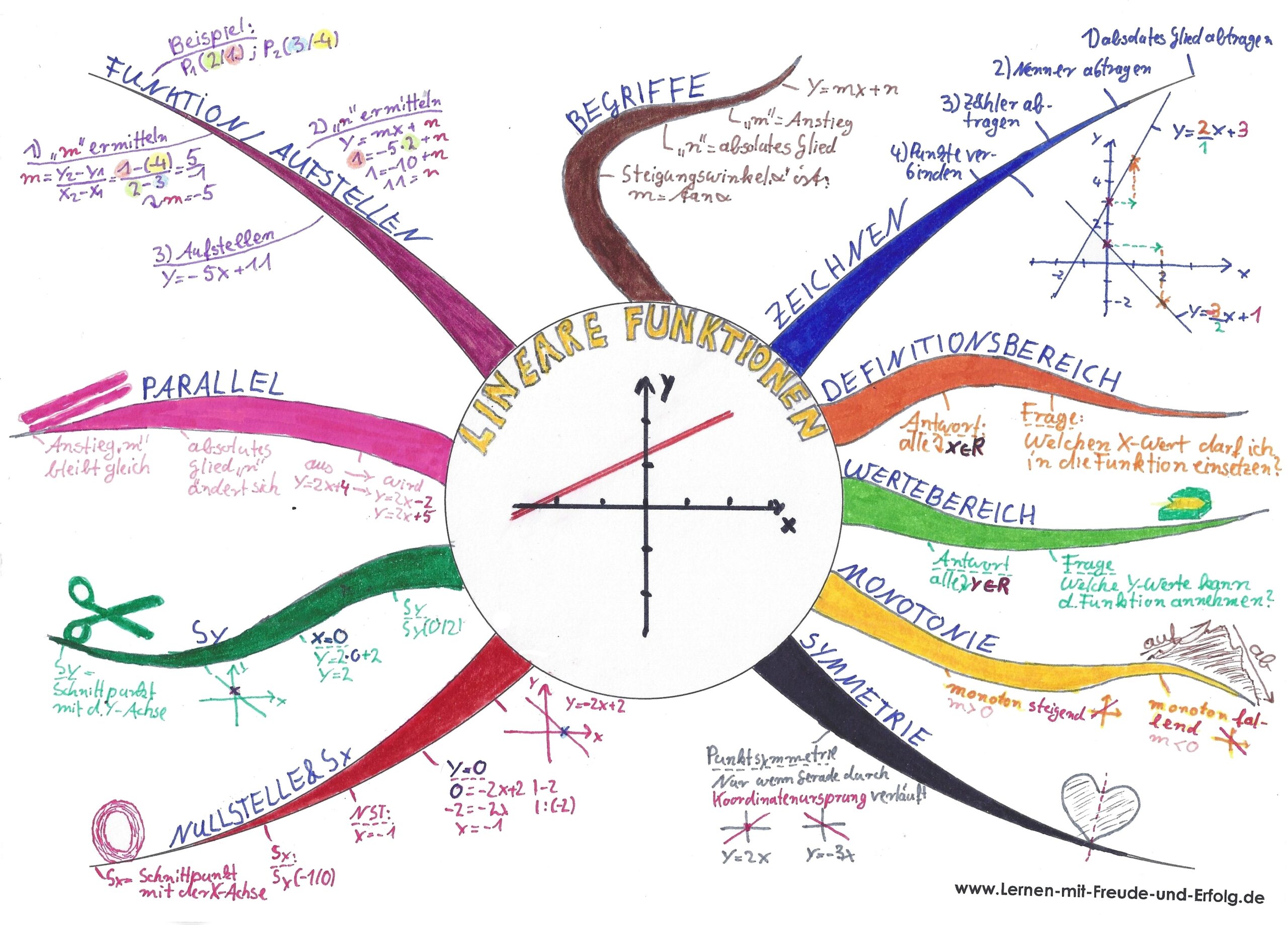 sind der Einstieg in das Thema Funktionen. Sie beschreiben Geraden und helfen dabei, Zusammenhänge zwischen zwei Größen darzustellen. Das folgende Mindmap zeigt dir alle wichtigen Inhalte zu linearen Funktionen auf einen Blick: