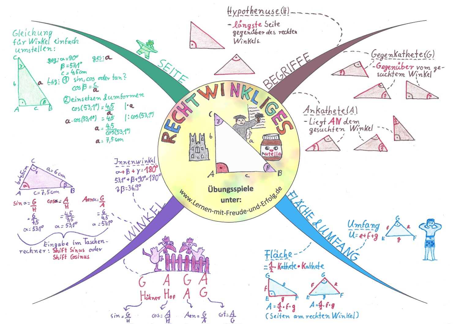 lassen sich Seiten und Winkel mithilfe von Sinus, Kosinus und Tangens berechnen. Diese Berechnungen gehören zur Trigonometrie. Die folgende Mindmap zeigt dir alle wichtigen Inhalte übersichtlich: