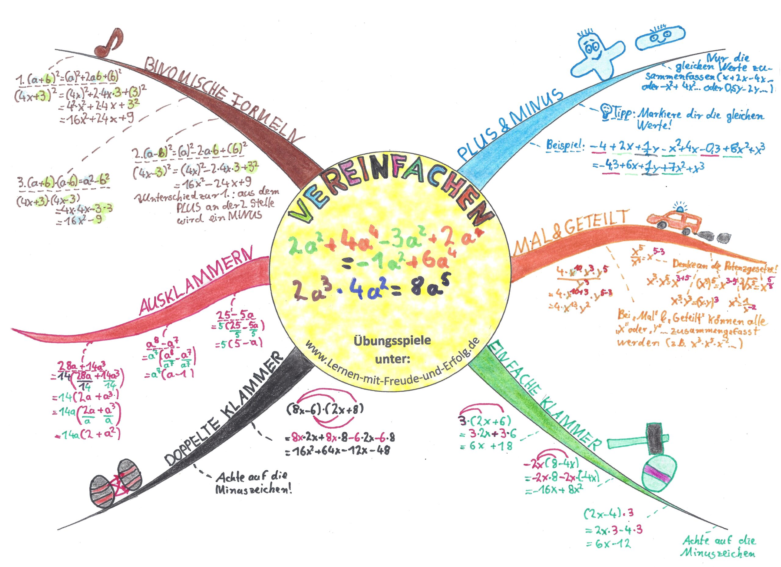 ist eine sehr wichtige Grundlage in der Algebra. Es beinhaltet mathematische Ausdrücke übersichtlich zu schreiben und zu berechnen. Das folgende Mindmap zeigt dir die wichtigsten Regeln und Methoden zum Vereinfachen von Termen:
